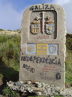 | O marco da fronteira com a Galícia. Os espanhóis deixam mensagens separatistas em qualquer lugar que faça alguma menção às províncias. |