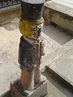 Fonte d’água em forma de palhaço em Villatuerta. Você aperta o nariz e ele cospe água..
