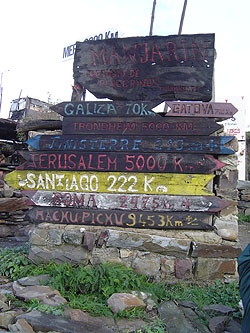 | A entrada do albergue em Manjarín, com placas indicando as distâncias para Roma, Jerusalém, Machu Pichu… |