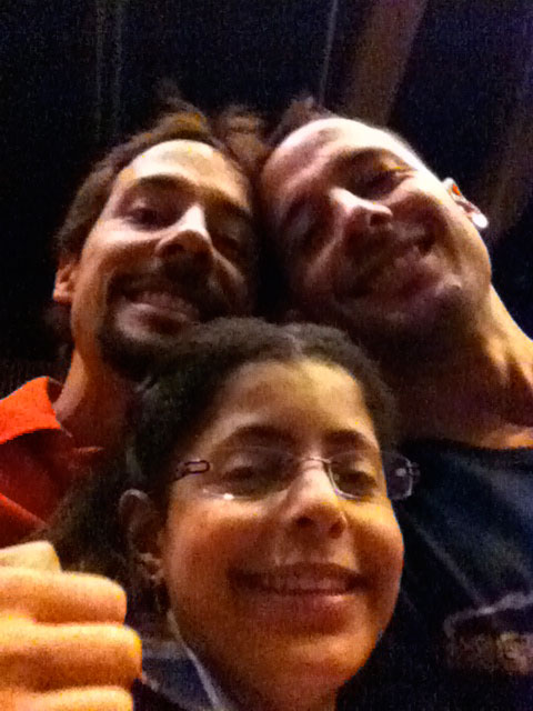 Meses depois que os ingressos tinham sido entregues no meu apartamento, o dia do show chegou e eu pude parar de ter medo que eles se perdessem de alguma maneira e levasse tanto estudo pro ralo. Show extra de segunda-feira, não era o dia mais cômodo, mas tem suas vantagens: a famiglia toda acabou vindo pra Sampa ao meio-dia, e assim conseguimos ter um dos raros almoços de todos os irmãozinhos juntos. À noite, Danilo foi me buscar no trabalho, e fomos eu, ele e Ana Paula para o Credicard Hall, seguindo fielmente as instruções do GPS do carro: Danilo não conhece SP, e eu sou ciclista, incapaz de reconhecer a ponte correta em que entrar na Marginal.Muitos anos atrás, na segunda vez que a Alanis Morissette veio fazer show em São Paulo, eu fui na pista com o Danilo, e essa acabou sendo uma experiência traumática pra ele: ficamos bem na frente do palco, saímos encharcados com o suor alheio, e ele mal conseguia ver o show porque seus óculos embaçavam. O argumento de que ele fez cirurgia de miopia e não usa mais óculos não contou pra nada: ele resolveu que ia ficar no fundo da plateia, longe do muco-vuco, porque era pra isso que serviam os telões.