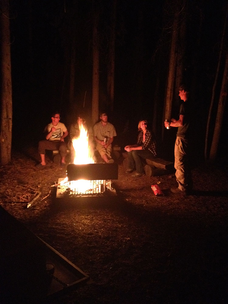 No lote ao lado do nosso tinha uma galera que nos convocou pra conversar ao redor da fogueira e tomar cerveja. Eu já tinha voltado a ser gente depois de tomar banho e comer, então aceitei o convite, apesar de estar pregado. Os anfitriões eram dois trilheiros, Harris e Dave, e com eles já estavam os ocupantes do lote do outro lado, Matt e Amy, um casal.