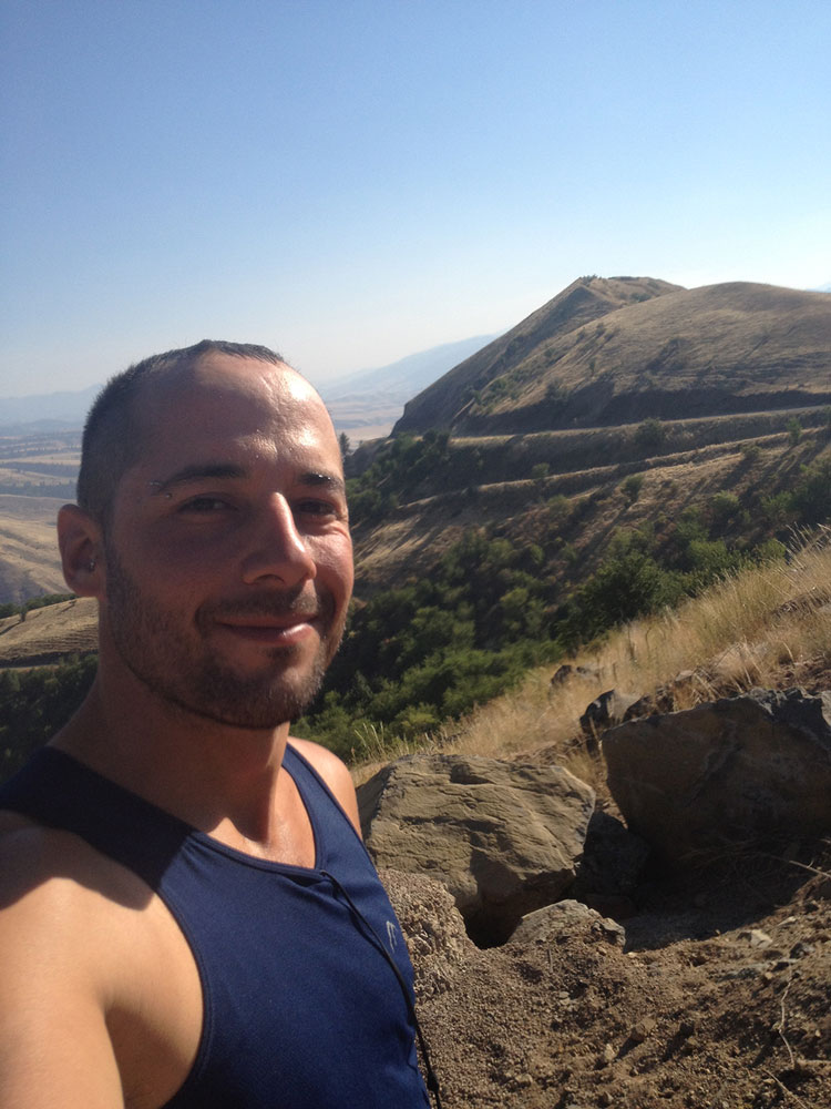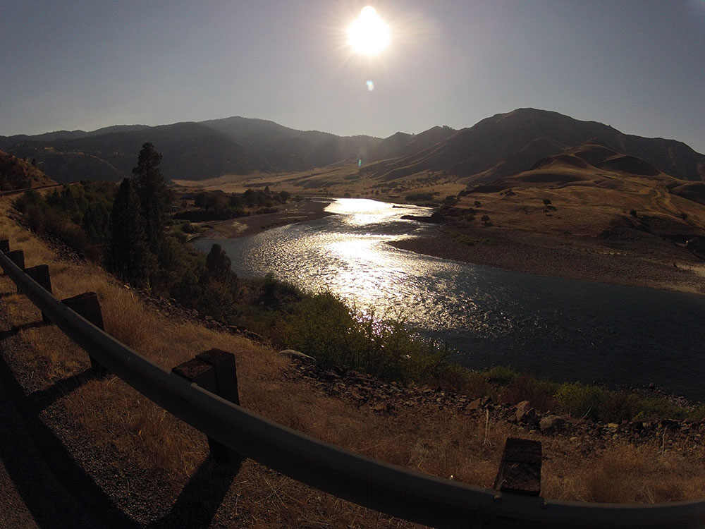 Depois de eu almoçar numa lanchonete meio riponga mas bastante gostosa em Grangeville, e ele almoçar num chinês na mesma cidade por não ter localizado meu veículo, conseguimos nos encontrar de novo para encarar a segunda metade da subida. O mapa da ACA propunha que a gente pegasse uma estrada antiga que era mais inclinada e mais comprida, por ter menos movimento. Foi mal aí, ACA, mas eu tiro tráfego de letra, e já passei por estradas bem piores nessa viagem. Rebeldemente seguimos pela estrada nova, toda moderna e com um acostamento bacana, até chegar no topo. De onde se via todo o resto da serra, num desses momentos em que você tem que parar para tirar foto. Os americanos, que são super ligados nessas coisas, preparam mirantes na beira da estrada em todos os melhores lugares. Assim, encostei num mirante, estava lá fazendo o meu melhor com o iPhone e a câmera do capacete, quando Lewis, em toda sua miopia, passa reto de novo, por mais que eu agitasse os braços. Comecei a me arrepender de não ter comprado um par de walkie-talkies mês passado.