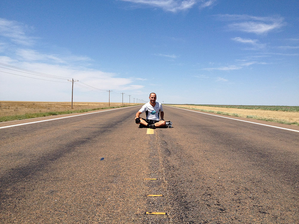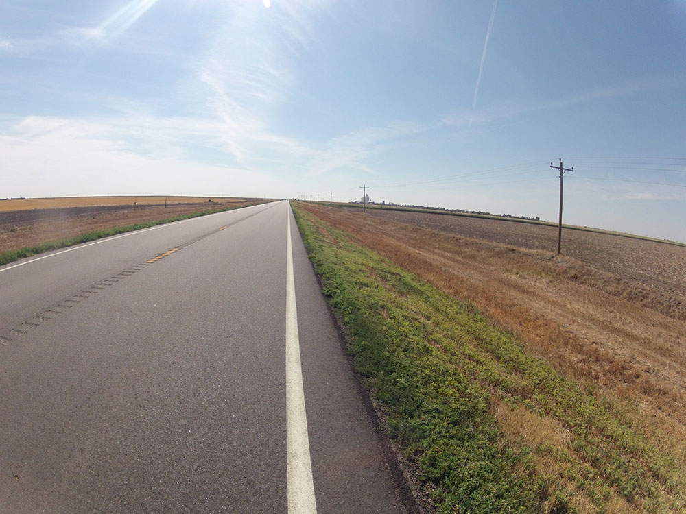 Chegamos na estrada que vai nos levar direto ao Colorado, a rota 96. Uma estrada que atravessa metade do Kansas em linha reta. Eu, que no sobe-desce da Virgínia não via a hora de ter horas de planuras no Kansas, agora tento não reclamar. Mas é dureza. A paisagem não muda, por mais que mude. É sempre uma plantação à esquerda, outra à direita, com horizonte traçado a régua láááá longe. Você se sente dentro de um desenho da Hanna-Barbera, com o fundo se repetindo sem parar.