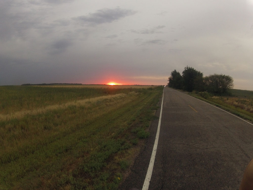 Tivemos uma chuvinha rápida de presente antes do sol nascer, tivemos um nascer do sol vermelho e lindo sobre a planura, tivemos uma falta de vento amigável, e nada. Troquei meus tradicionais podcasts por música no iPod, porque estava com sono e dando umas piscadas mais longas que devia. Quando se pedala por dezenas de quilômetros em linha reta, é incrível quanta coisa o seu corpo automatiza, tenho certeza que se eu bobeasse tiraria um cochilo e só acordaria quando meu nariz batesse contra o asfalto, sem jamais parar de pedalar.